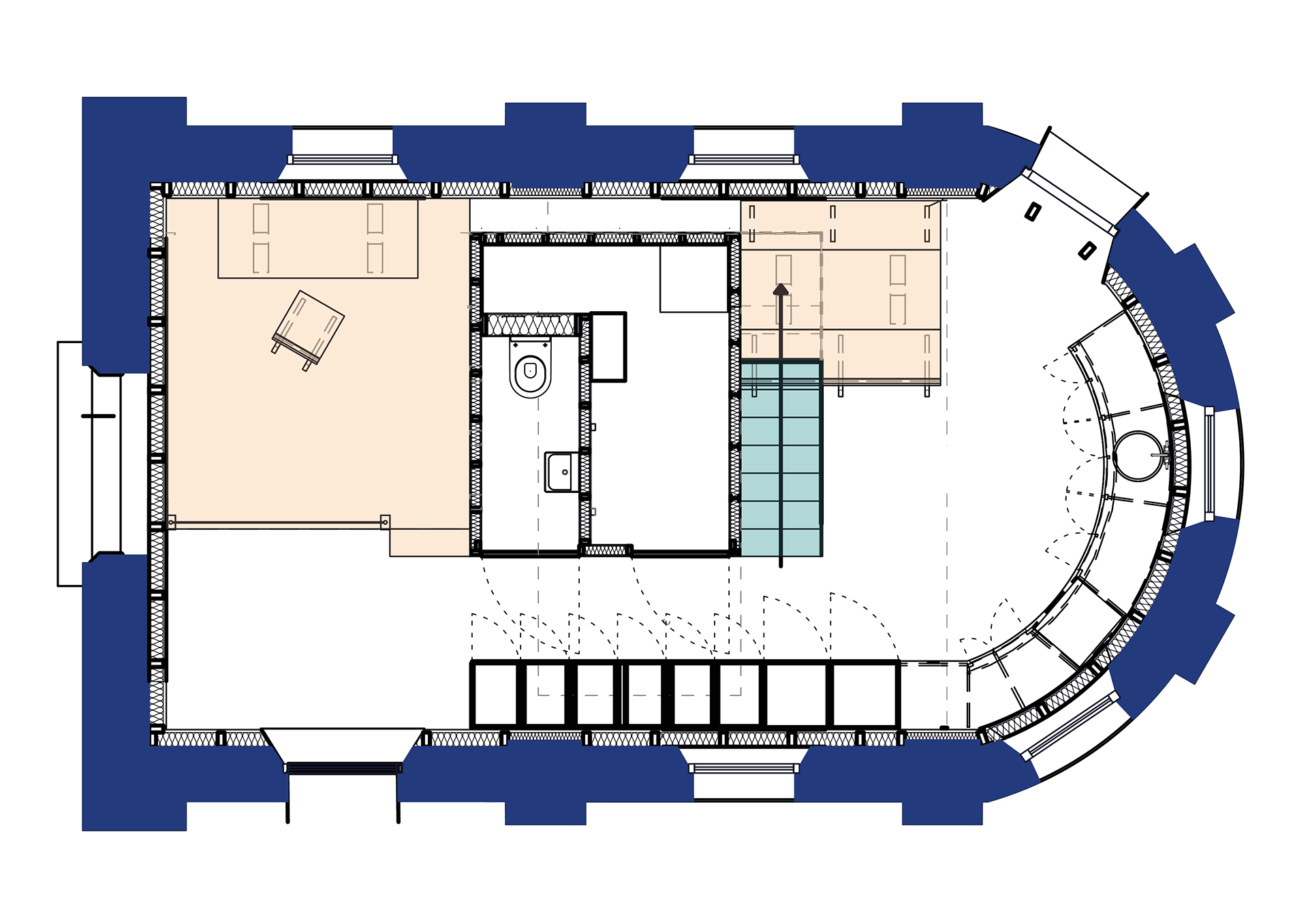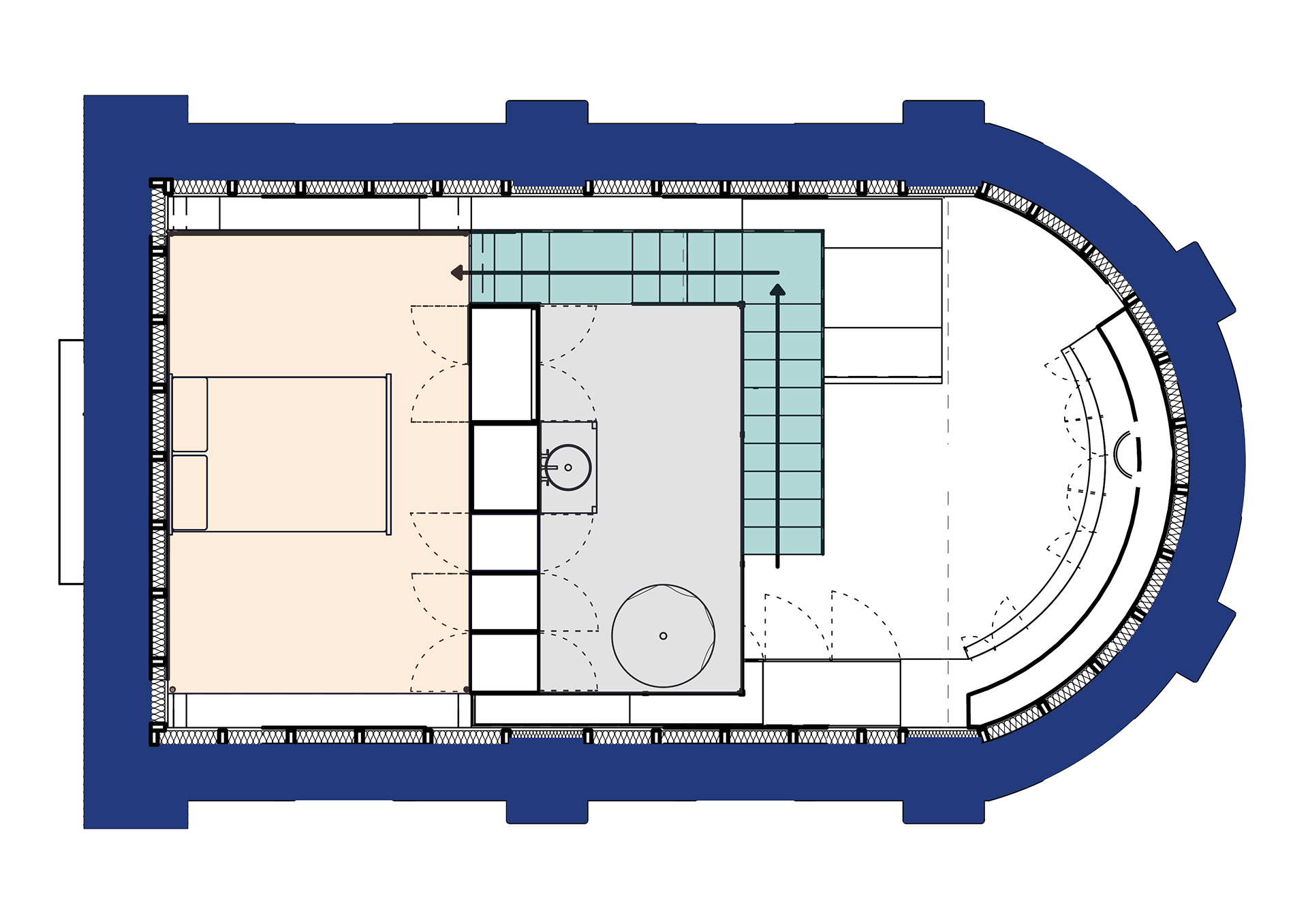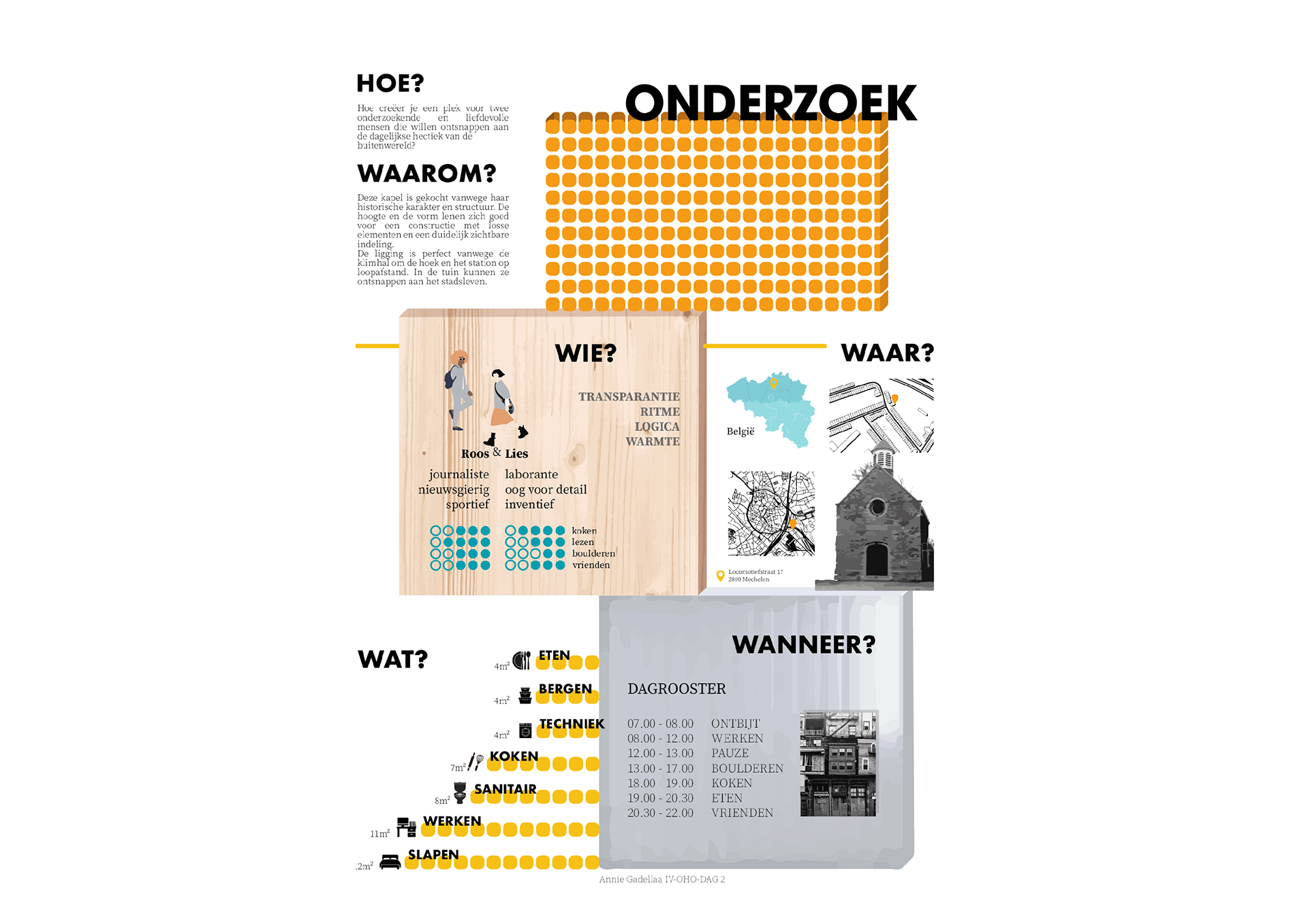 QUAERERE is a chapel made into a cosy home for a couple in their mid-thirties. Inspired by the curiousity of the couple and their jobs as researcher and journalist, their home is well organised. Some functional spaces are stacked on top of each other in the middle. With this, a big kitchen and a spacious home office are created. All of the spaces are defined using different materials.